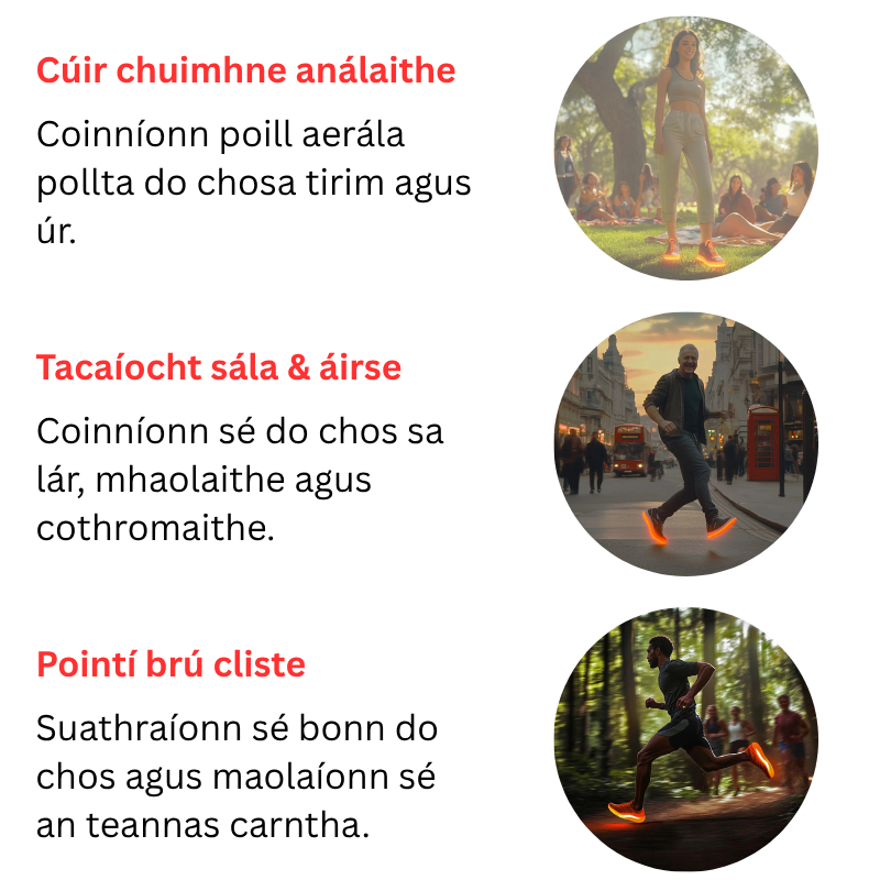 Sea, oireann siad do bhróga reatha, bróga ócáideacha, bróga oibre, agus fiú buataisí — níl le déanamh ach iad a ghearradh más gá chun feistiú foirfe a fháil.